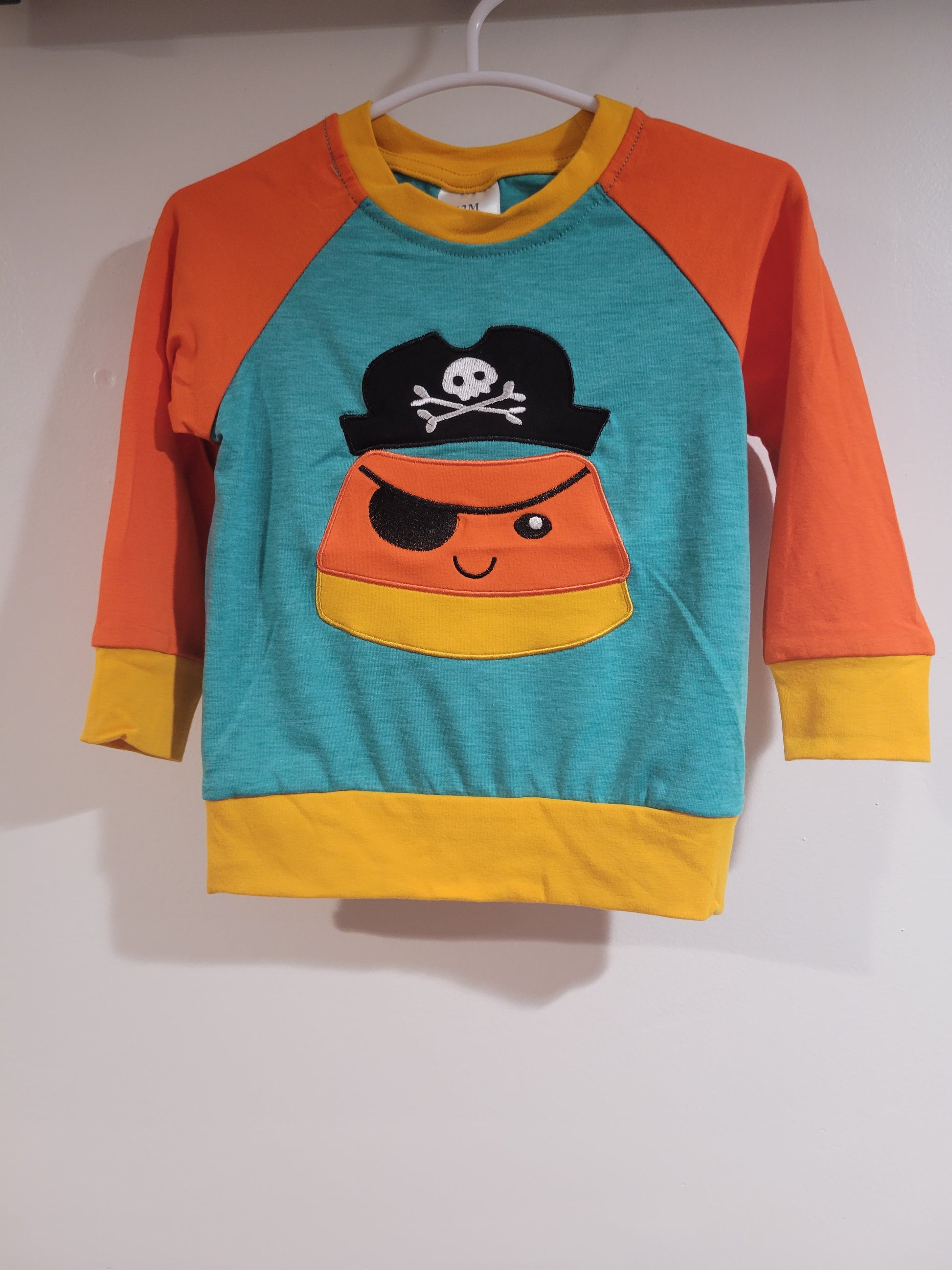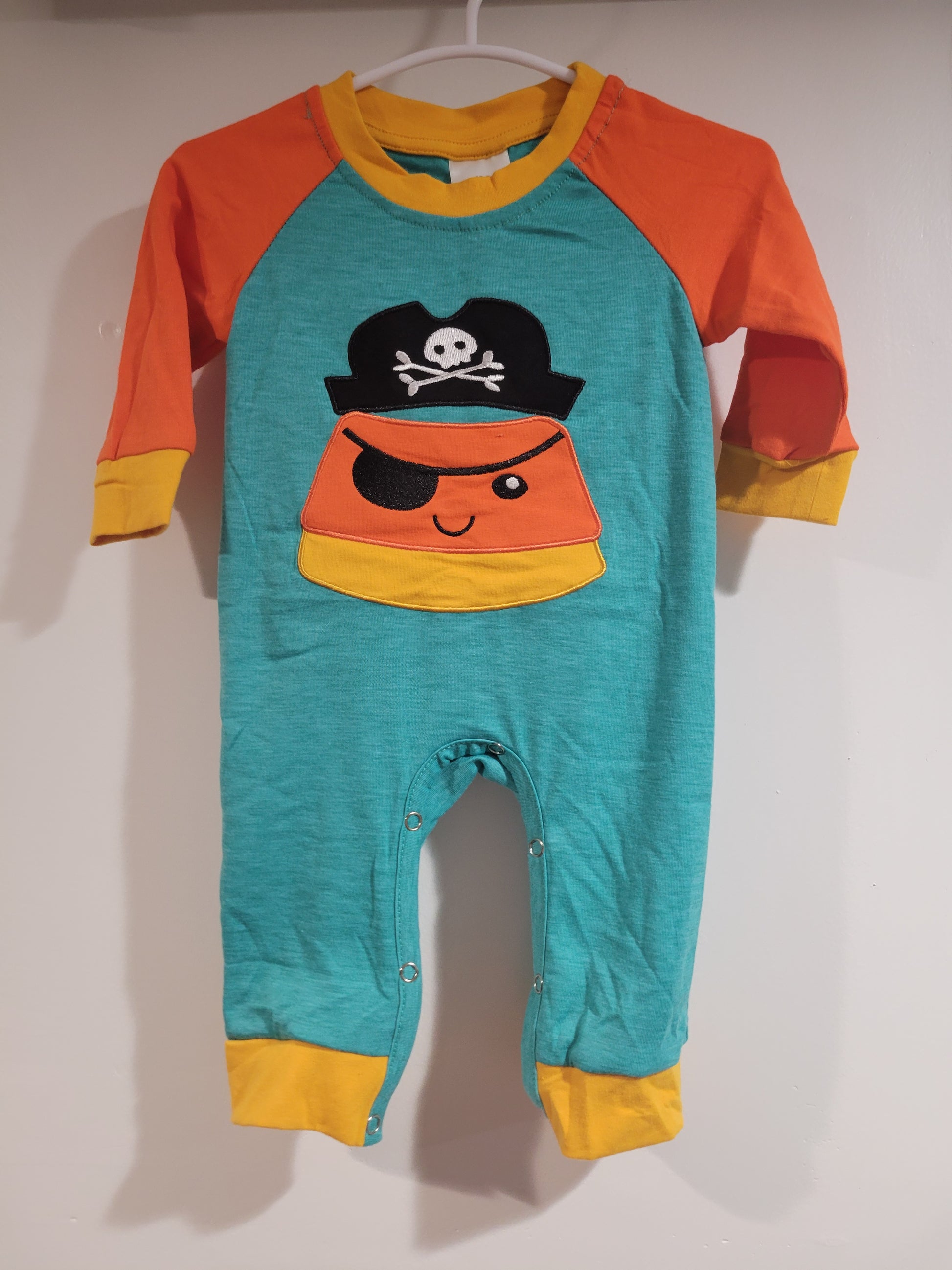 A candy corn disguised as a pirate? Yes please! Available in a romper and long sleeve shirt.