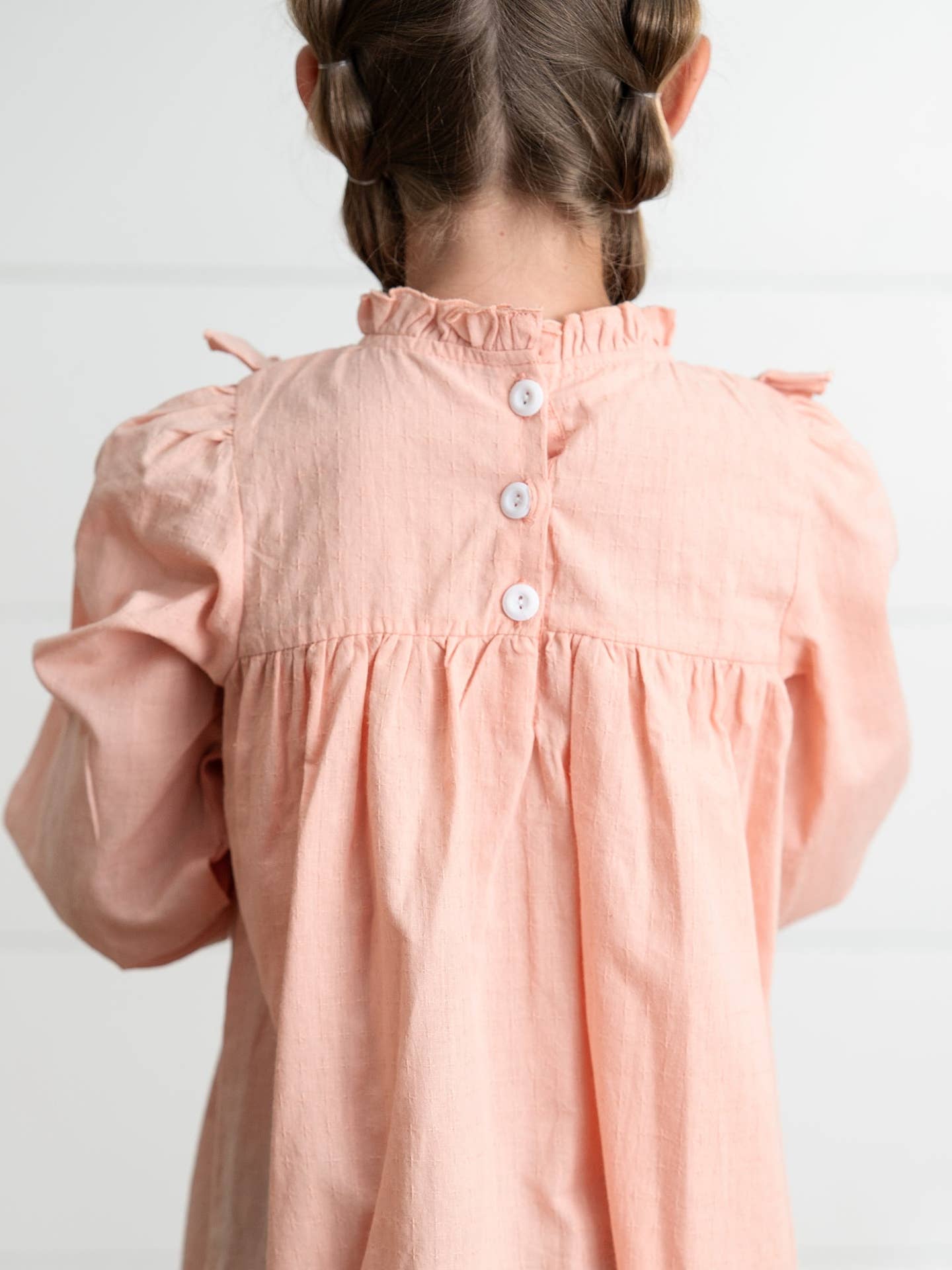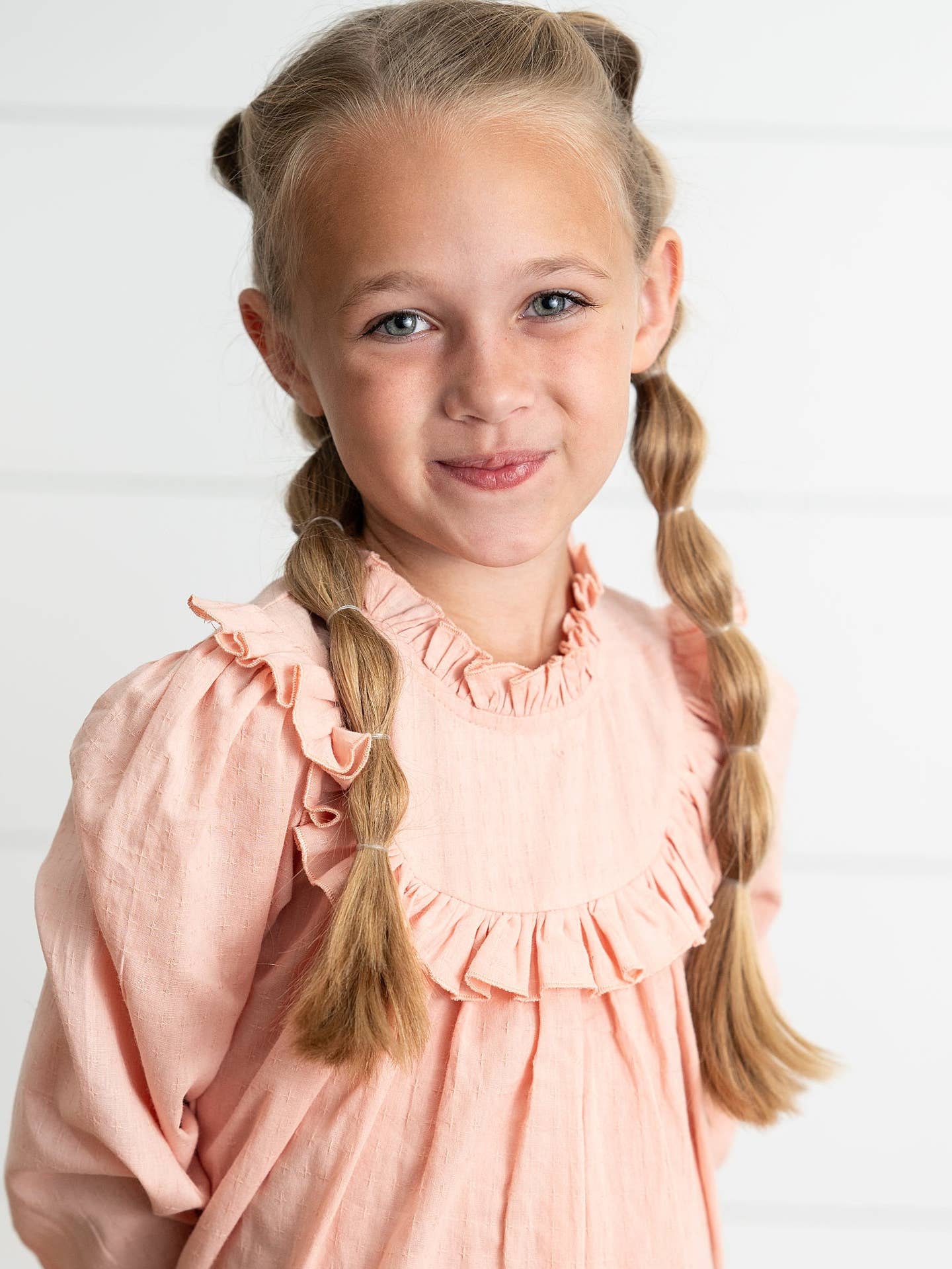 Flutter into style with the Annie blush ruffle dress! This playful dress features delicate ruffles and a flattering blush color, perfect for any occasion. Button detail on the back makes this dress a must-have addition to any little fashionista's wardrobe.