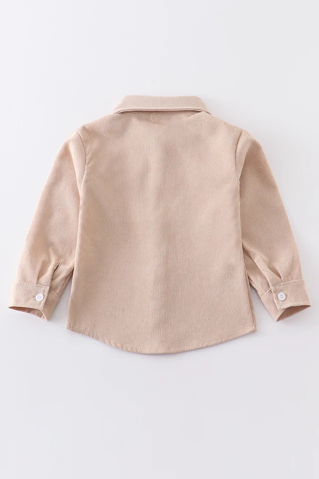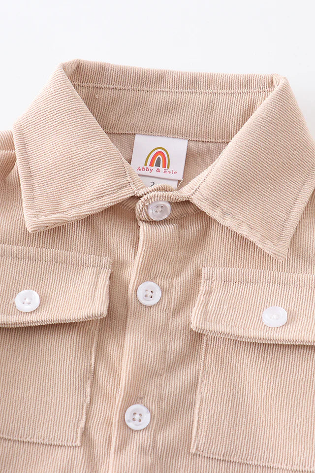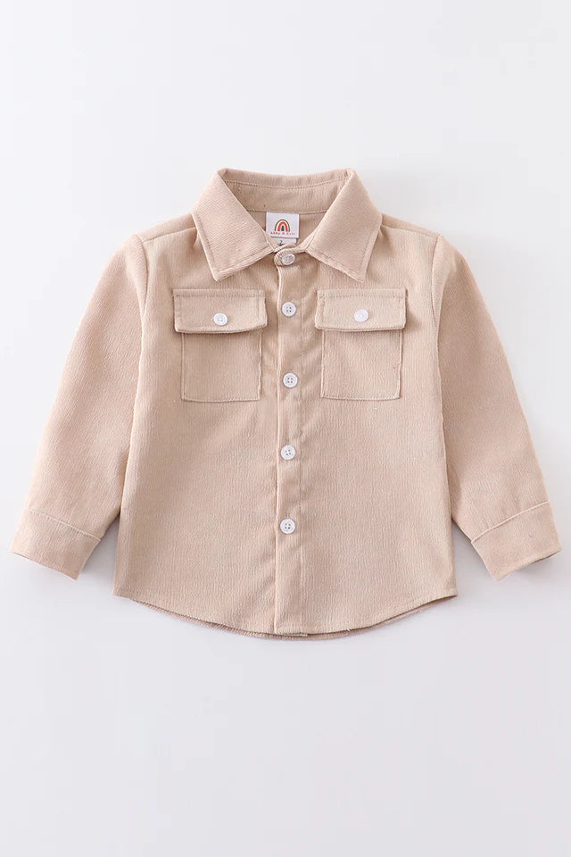 Look sharp in this classic beige corduroy button-down shirt! Made from a soft, comfy fabric, you'll be sure to stay stylishly warm. Great for boys and girls!