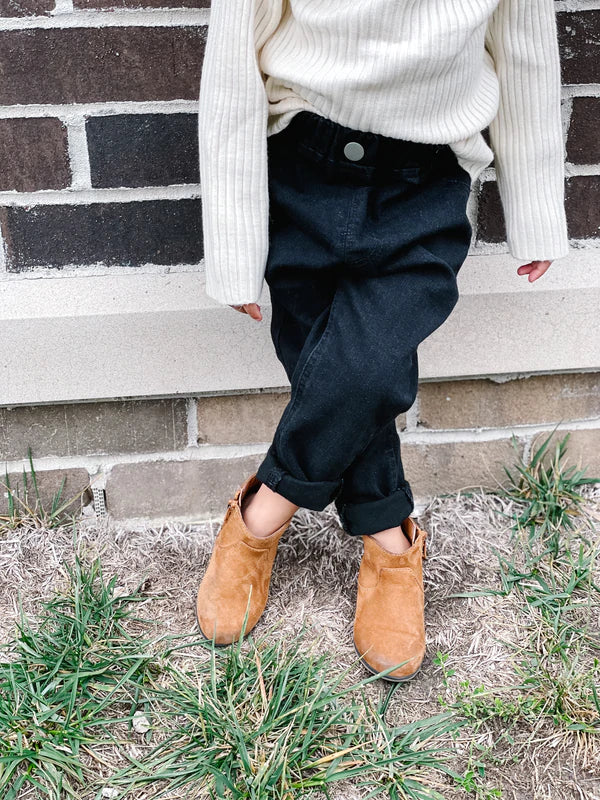 The perfect black denim for kids-boys or girls! Features functional back pockets, and non-functional button on the front. Easy pull-on jeans! Straight leg style fit.