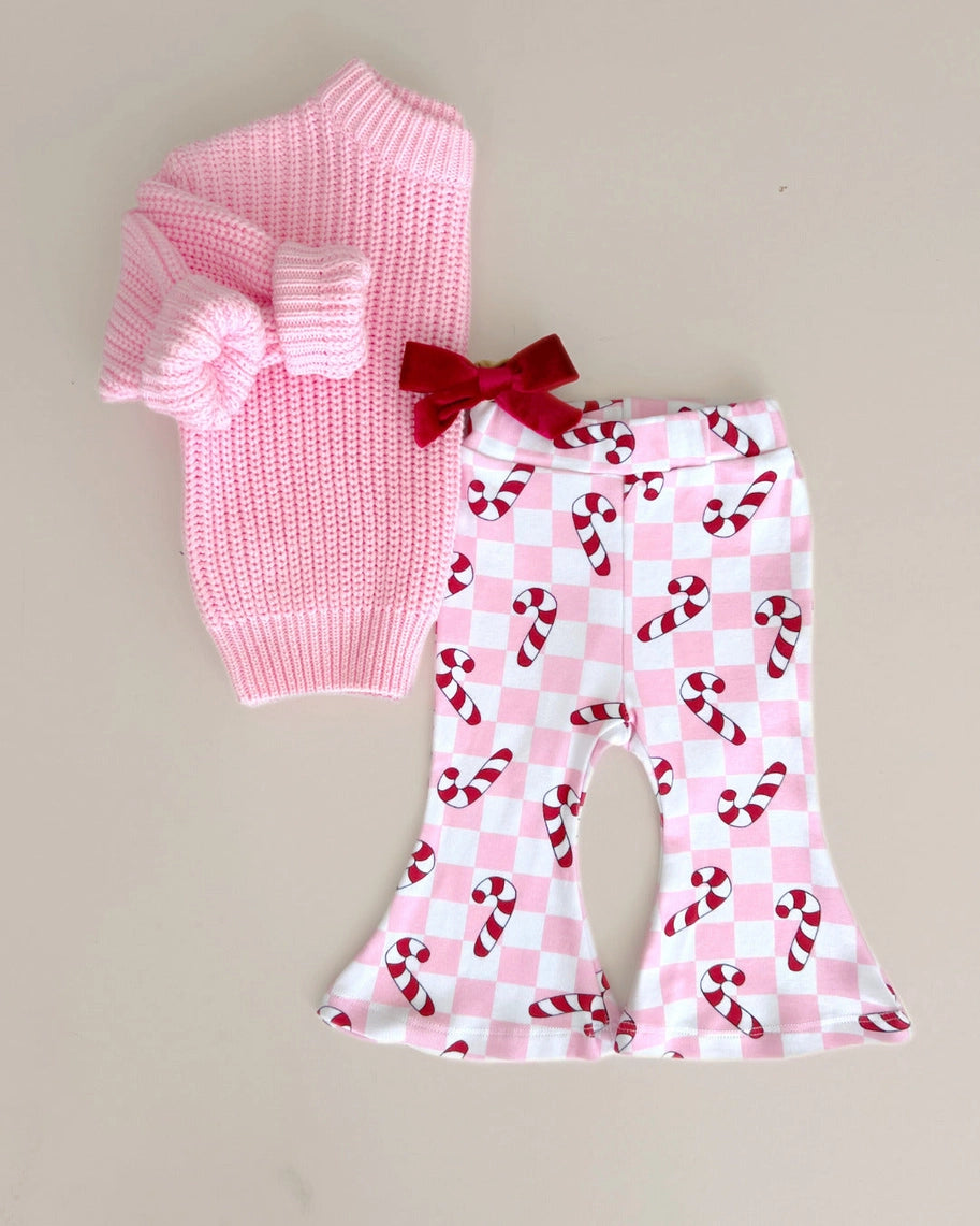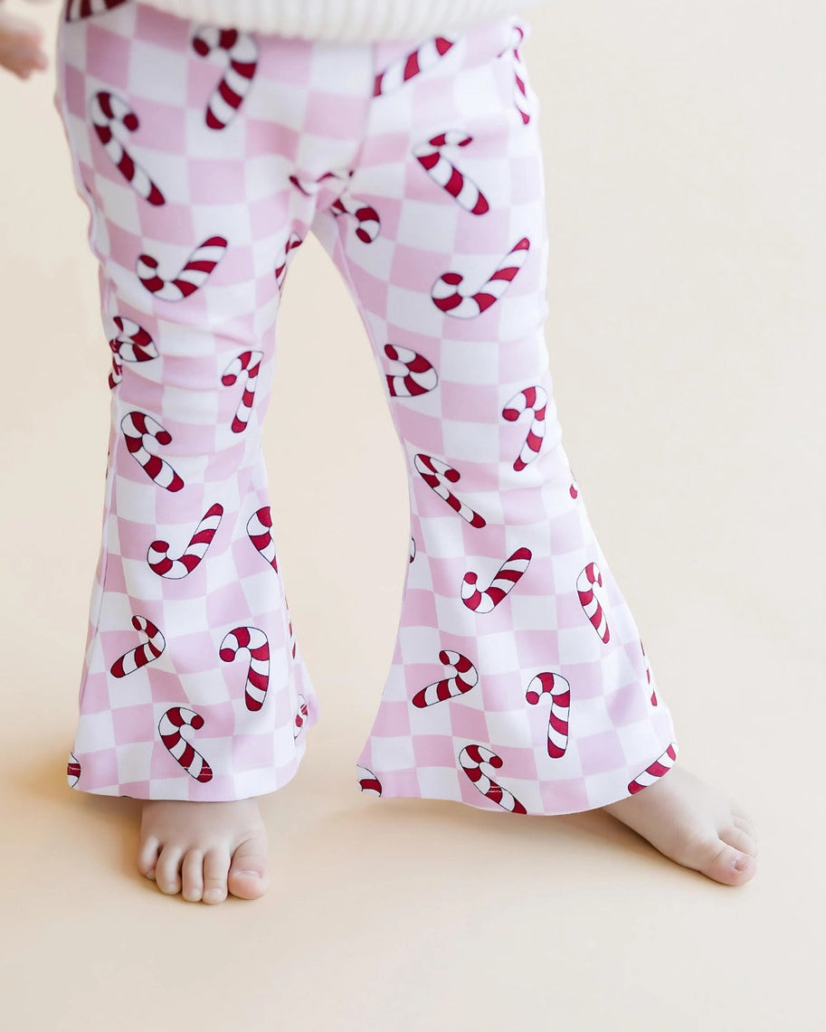 Festive pants with checkered candy cane print and an added flare. These stylish pants are a perfect way for your little one to make a statement this holiday season! They're so soft and cozy! Pair them with a chunky knit sweater for such a cute look!