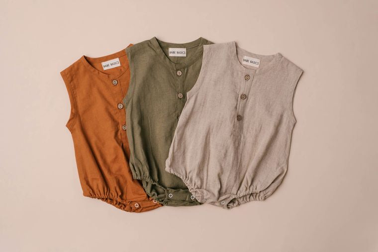 This lightweight, breathable romper is made of a linen/cotton blend. Soft, comfy and safe material for your children!