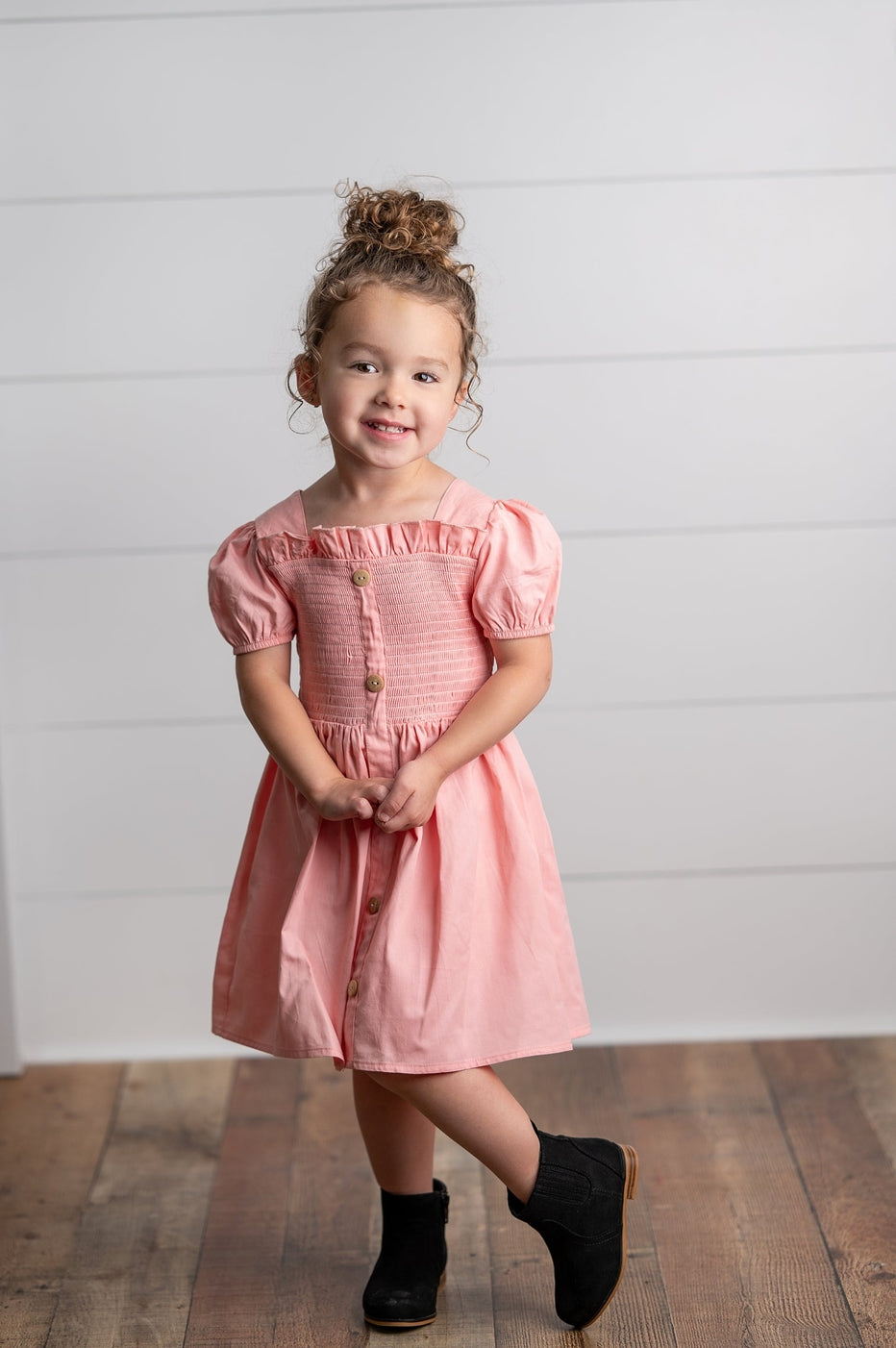 Get ready for Spring, Summer and Fall with this pink shirred dress! This dainty dress features puff sleeves, a shirred bodice, and a ruffle neckline for a fun and feminine look. Perfect for Easter or any special occasion. Button front for easy dressing. Wear with buttons on the front or back! 100% Cotton