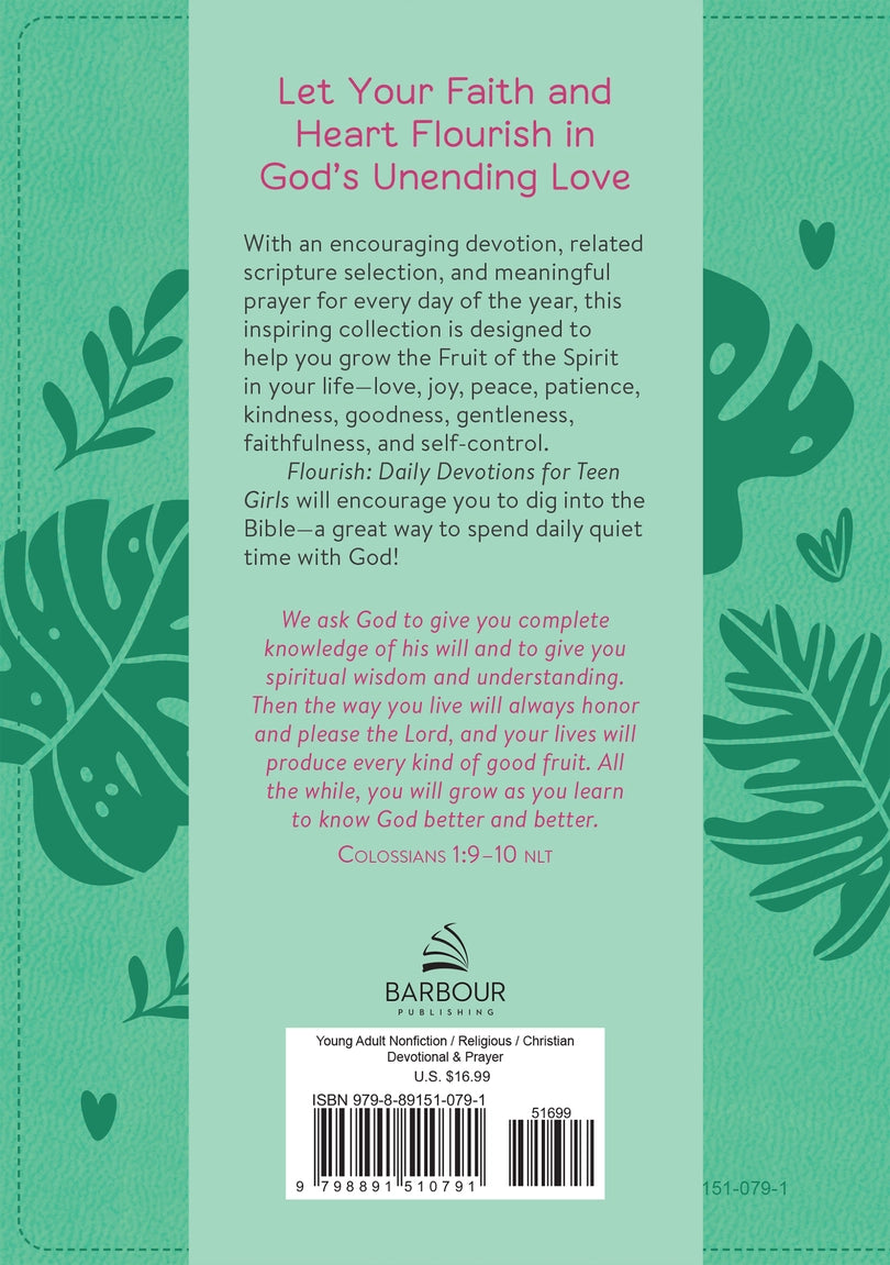 Let your faith and heart flourish in God's unending love with an encouraging devotion, related scripture selection, and meaningful prayer for every day of the year. This devotional collection is designed to help teen girls, 13 and up, grow the Fruit of the Spirit in their lives with love, joy, peace, patience, kindness, goodness, gentleness, and self-control. Flourish: Daily Devotions for Teen Girls will provide both encouragement and faith building inspiration as readers dig into God's Word. These beautiful devotions are a great way to motivate teenagers to spend daily quiet time with God!