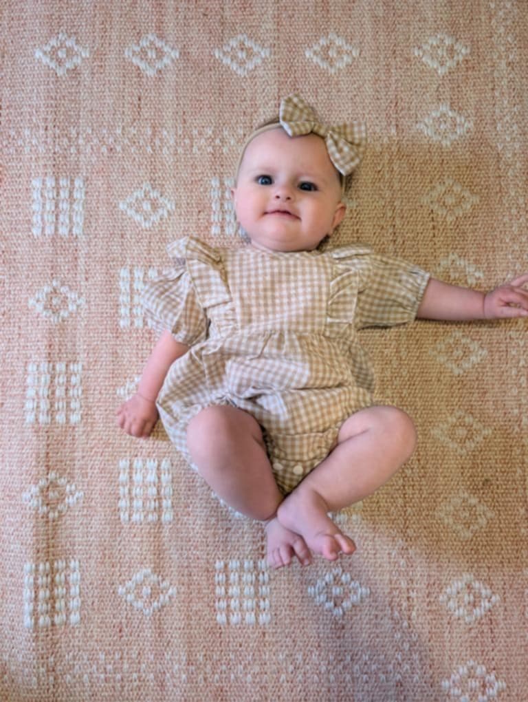 The perfect little beige gingham printed romper for Spring, picnic style!