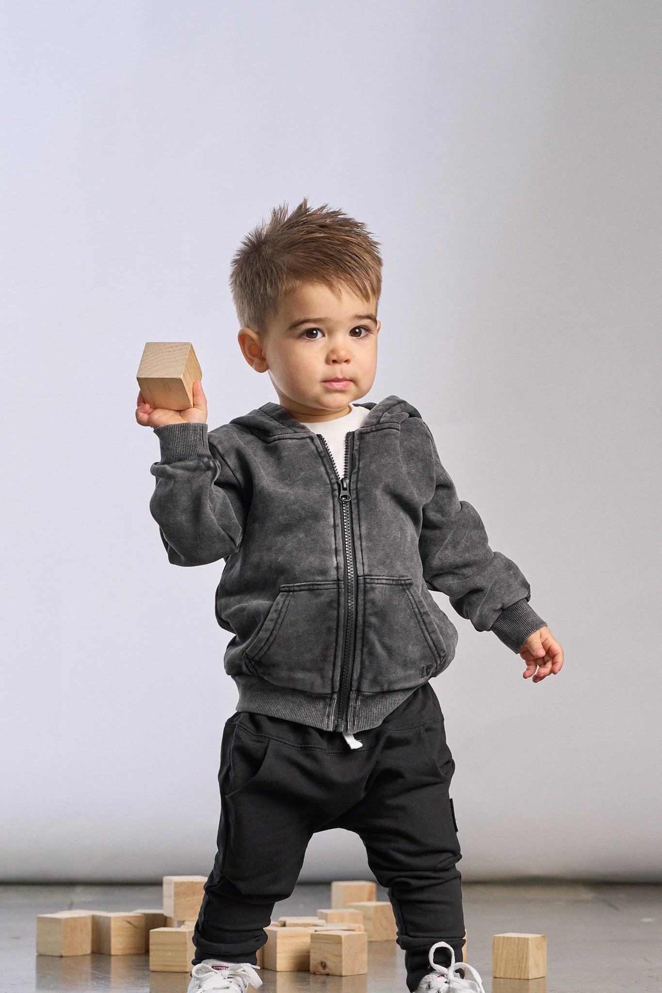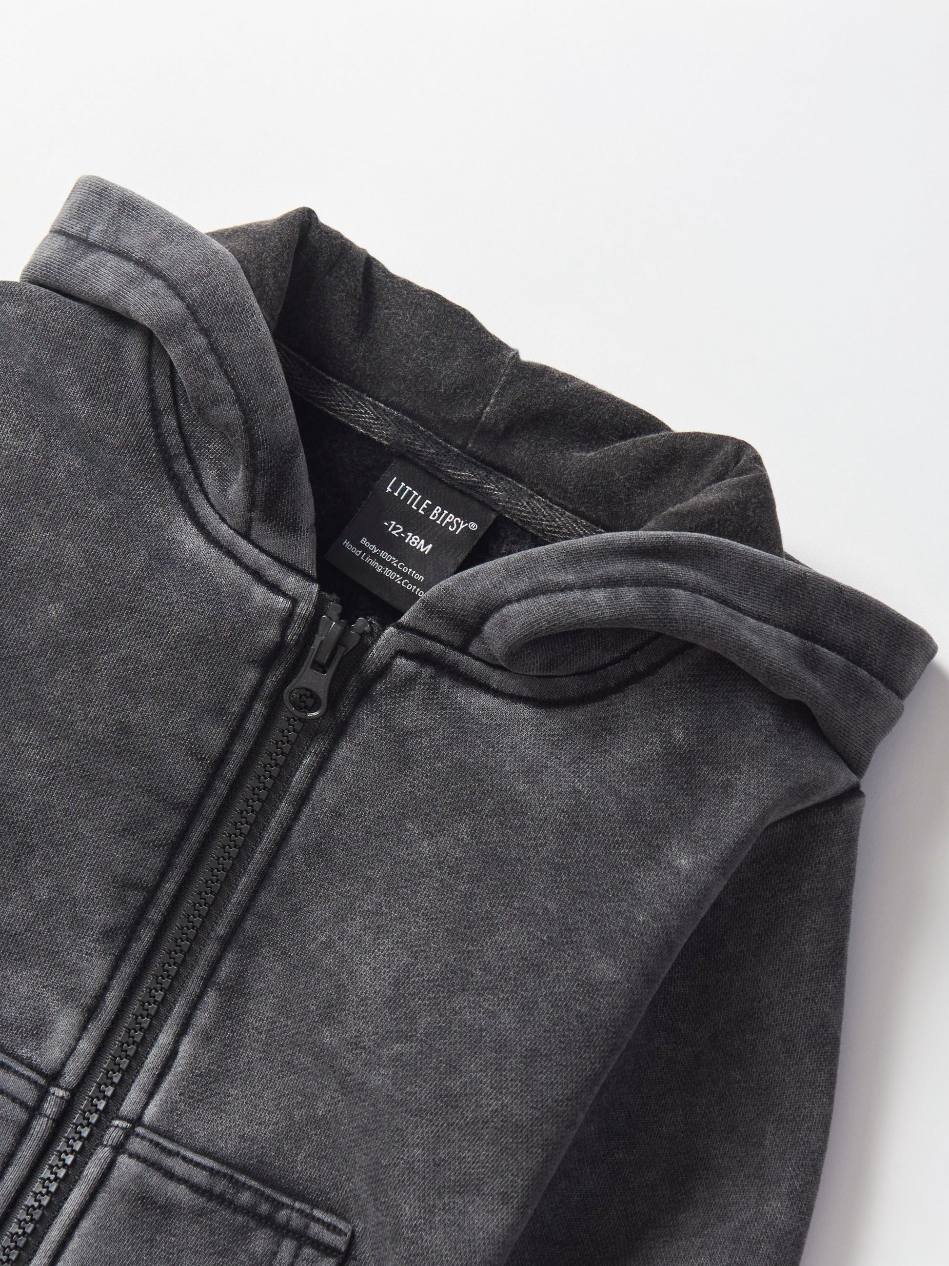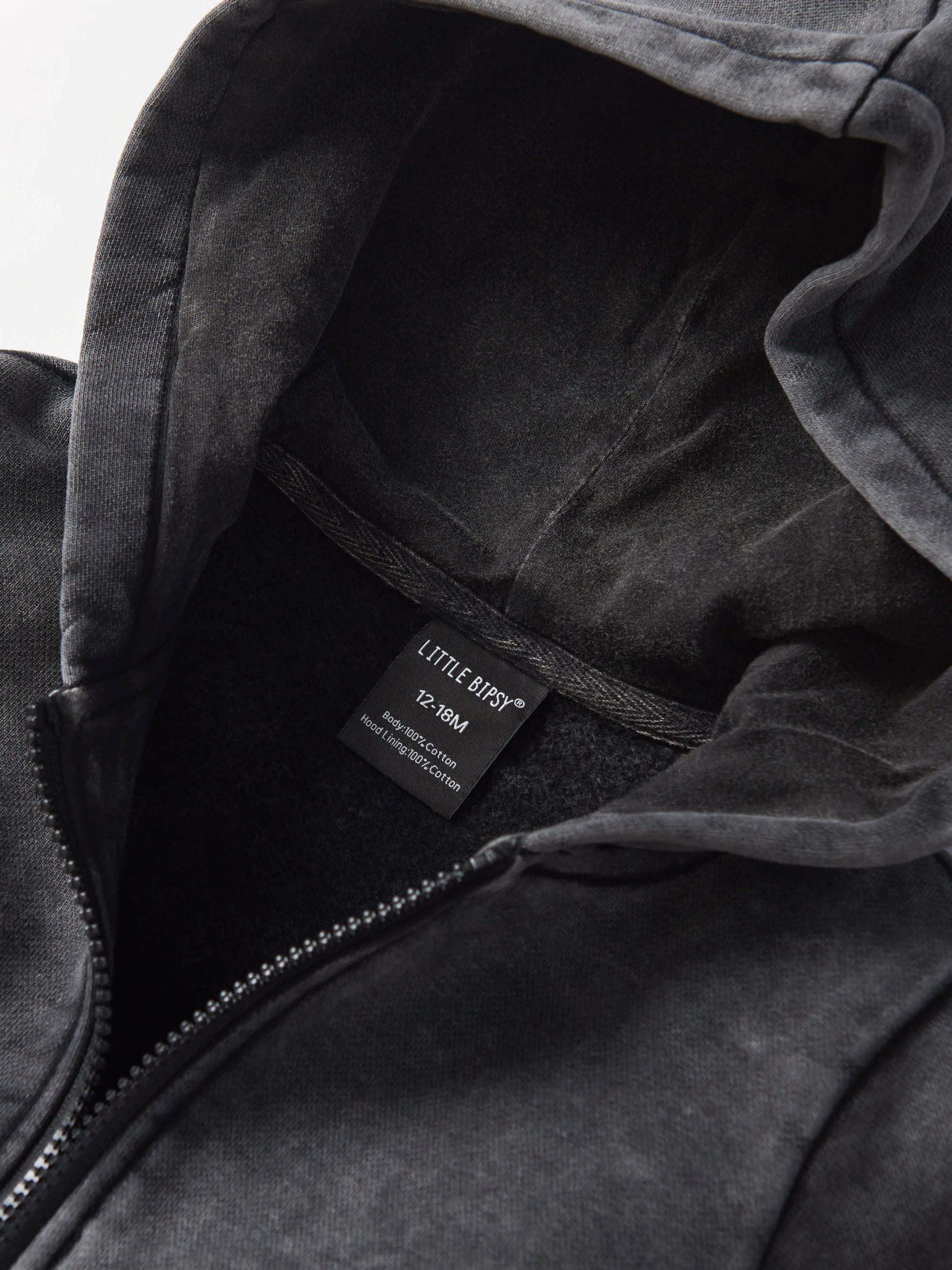 The perfect hoodie for everyone in the family! Whether you're heading to school, playing outside, or just chilling at home, this hoodie has you covered in comfy style. Featuring a full zipper for easy on and off, a cozy hood to keep your head warm, and functional front pockets to stash your stuff or warm up your hands. The stylish black acid wash gives it that effortlessly cool, lived-in vibe everyone loves.