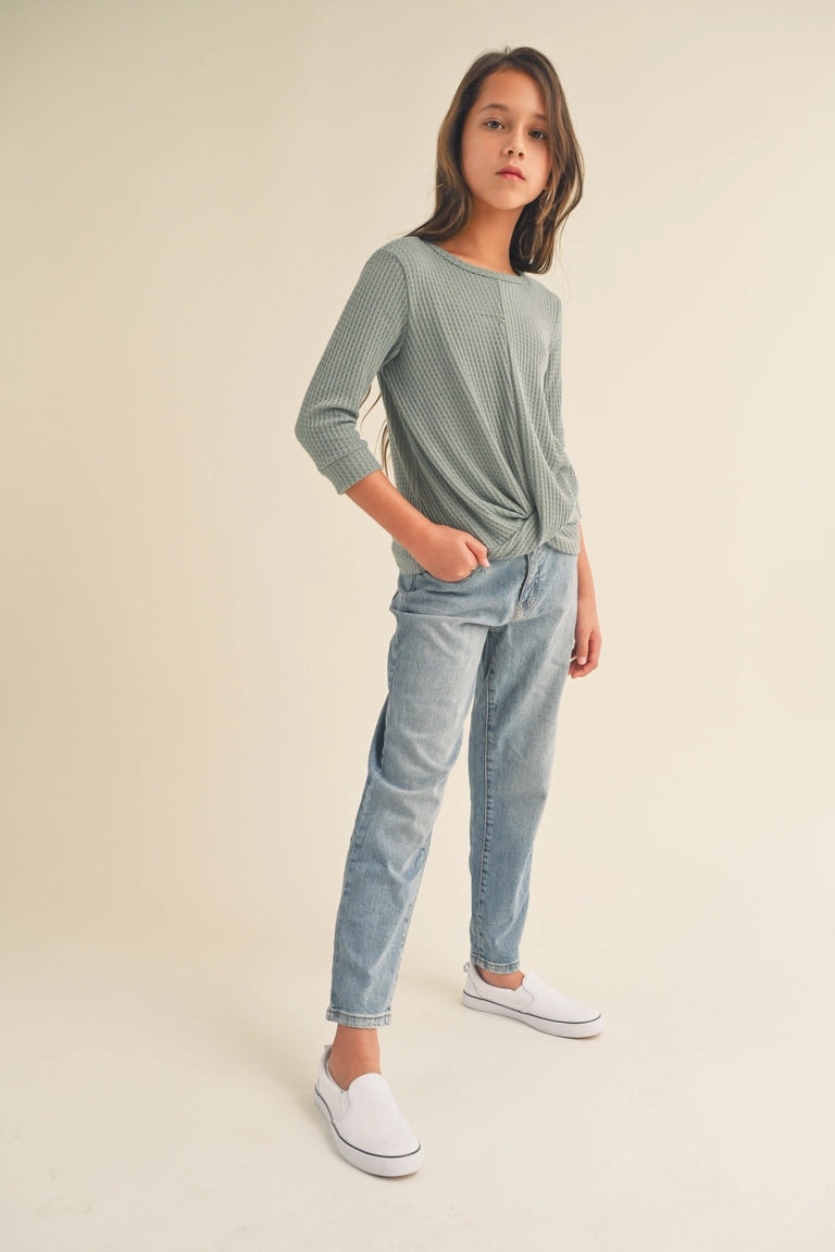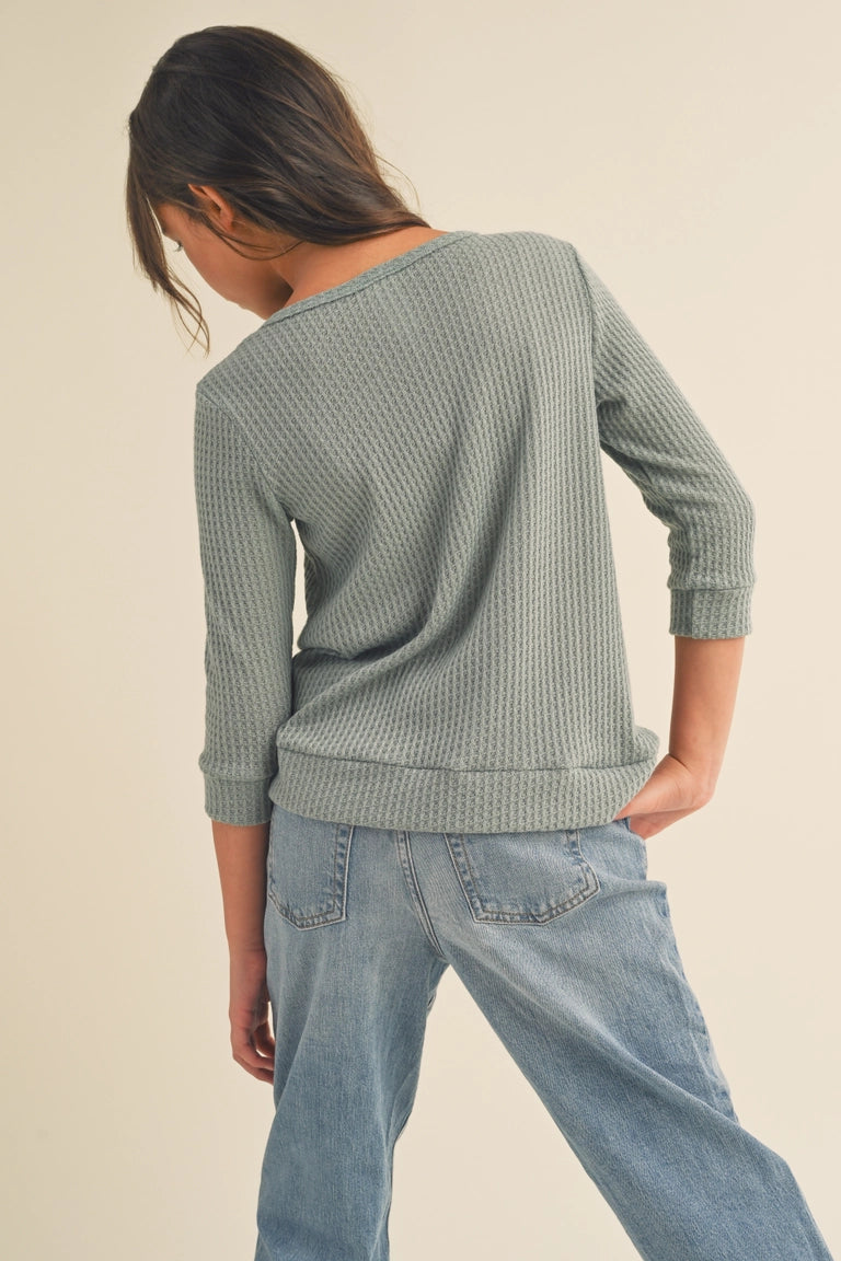 This top features a waffle knit material and knotted front. With 3/4 sleeves, this is a great top to transition into Fall and Spring!