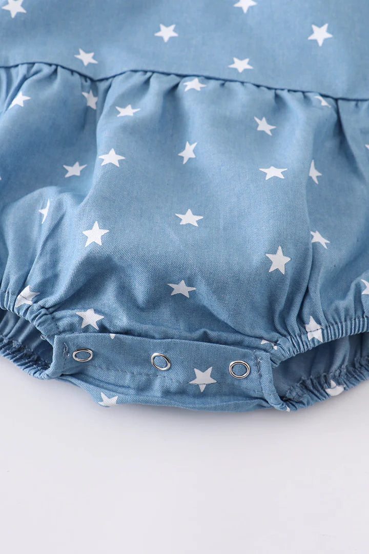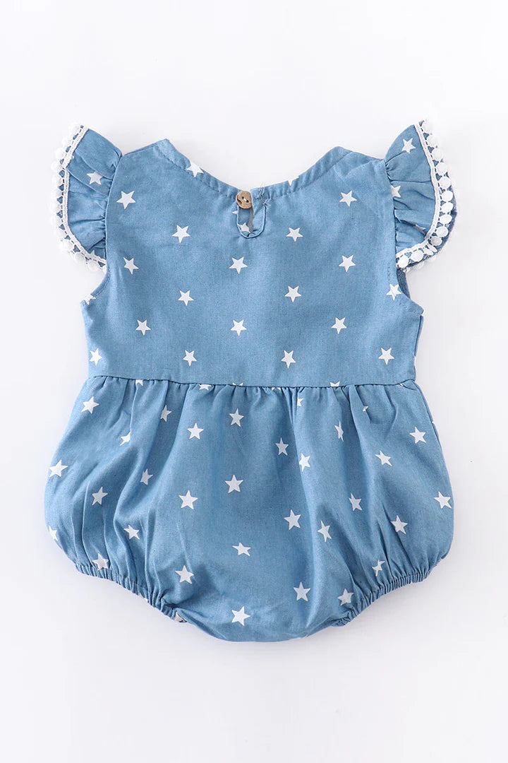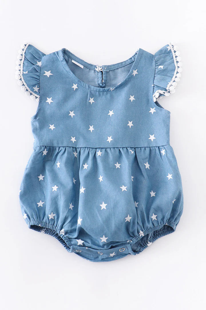 Perfect for July 4th or any day! Featuring a playful navy star print and adorable pom pom accents, this romper will keep your girl comfortable all day!